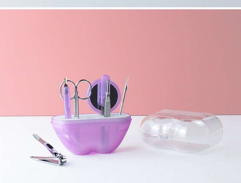 This is a creative apple-shaped nail tool eight-piece manicure and eyebrow clipper set.Specifications: The set comes in four colors: purple, green, blue, and pink. One piece has eight trimming tools;Material: fine steel + stainless steelOthers: The packaging is carton, the weight of the whole product is about 110g, the size is about 11*10*4.6cm;Note: The shipment quantity of this product is 3 pieces, less than 3 pieces will not be shipped.
