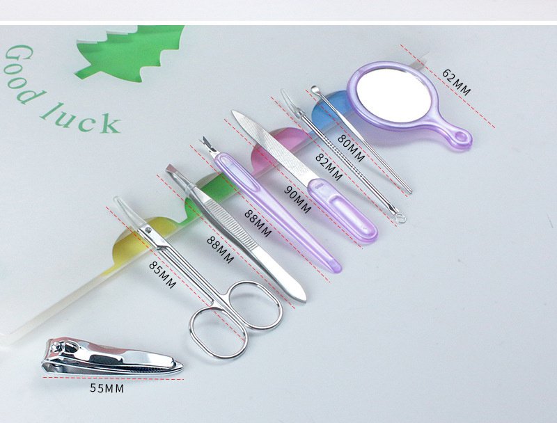 1.Kit includes: nail clippers, eyebrow clip, eyebrow scissors, acne needle, small round mirror, ear scoop, dead skin fork, nail file, length of 60-80mm;