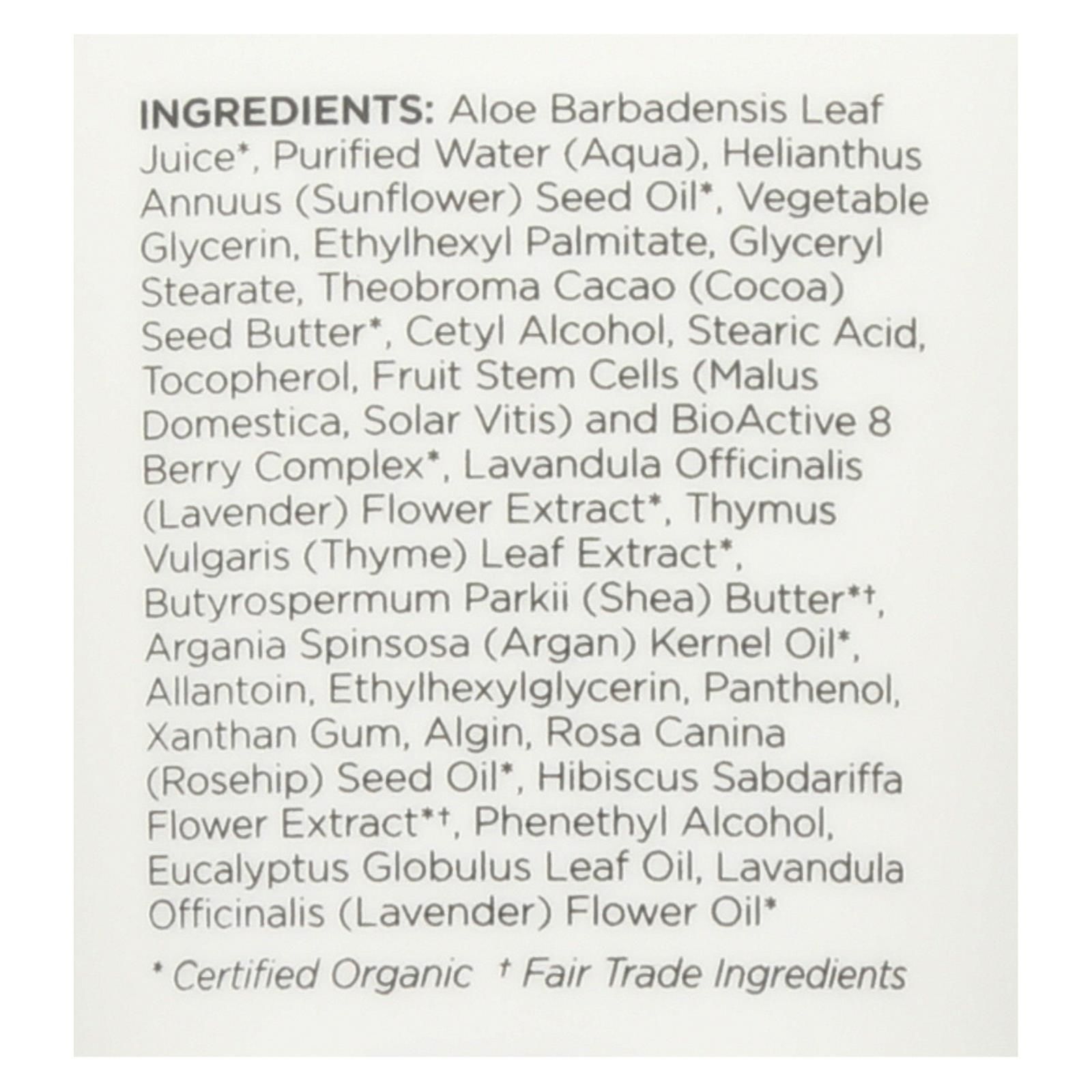 ingredients : aloe barbadensis leaf juice;purified water;aqua;helianthus annuus;sunflower;seed oil;vegetable glycerin;ethylhexyl palmitate;glyceryl stearate;theobroma cacao;cocoa;seed butter;cetyl alcohol;stearic acid;tocopherol;fruit stem cells;malus domestica;solar vitis;and bioactive 8 berry complex;lavandula officinalis;lavender;flower extract;thymus vulgaris;thyme;leaf extract;butyrospermum parkii;shea;butter*†;argania spinosa;argan;kernel oil;allantoin;ethylhexylglycerin;panthenol;xanthan gum;algin;rosa