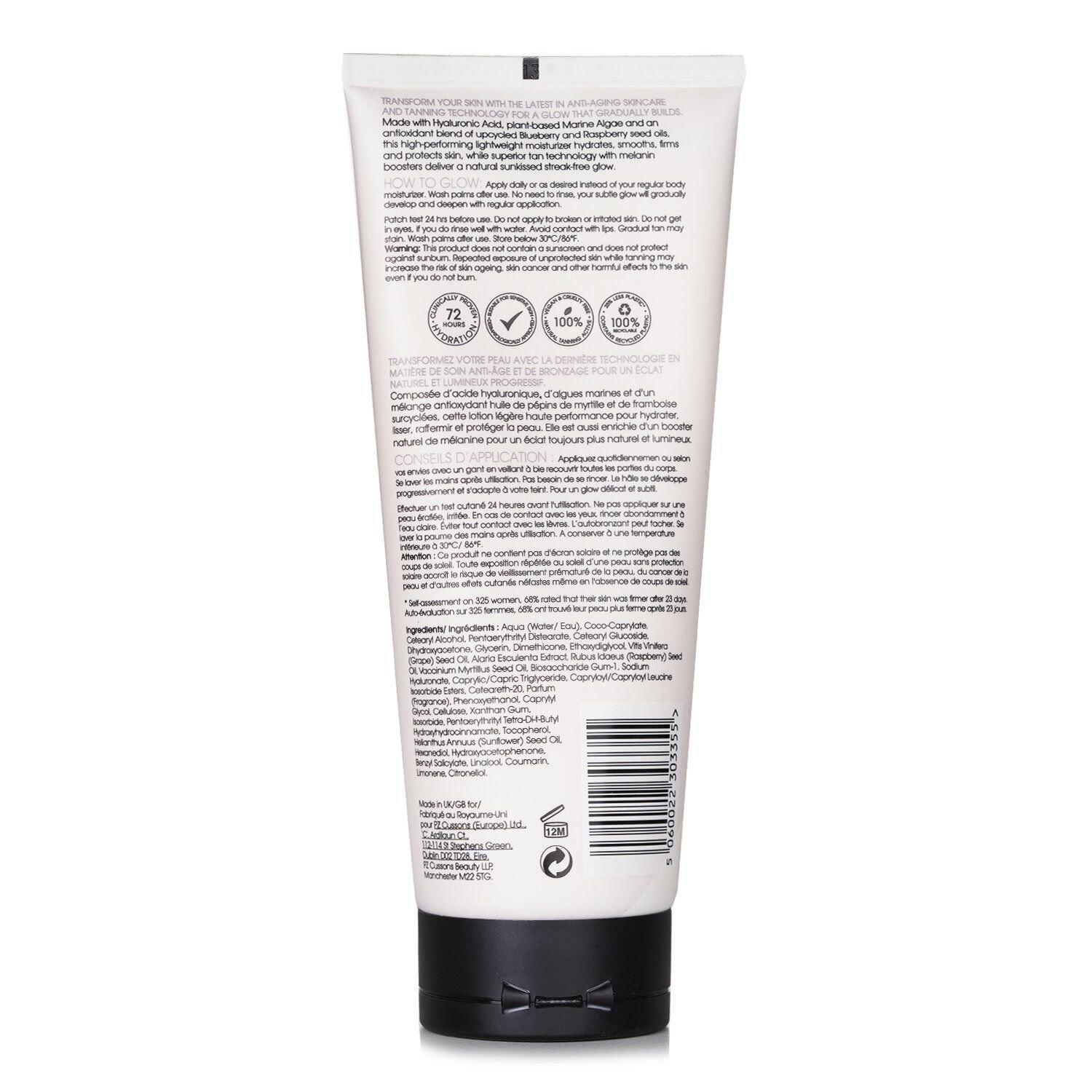 A subtly-tinted daily youth boosting body moisturizer with 95% natural ingredientsMulti-tasking formula combines 5 super skincare benefits with a daily dose of glow to hydrate, protect, smooth, firm & plump skin every dayUltra-hydrating yet lightweight texture melts into skin, dissolves quickly with a new fine fragrance for all day wearMade with high molecular weight Hyaluronic Acid, plant-based Marine Algae & an antioxidant blend of upcycled Blueberry & Raspberry seed oilsUses superior tan technology & melanin boosters to gradually build a natural sun-kissed glowShields skin from digital pollution-induced aging with blue-light protectionImproves skin’s texture & locks in moisture for up to 72 hoursPerfect for all skin tones, suitable for sensitive skinStreak-free & easy to applyVegan friendly, 100% natural tanning active, cruelty-free